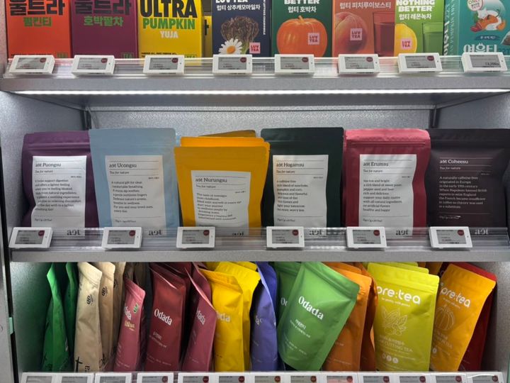 韓国では、薬局などを中心に手に入るむくみ取りや体を温めるのにいいとされるお茶も手軽にアクセスできますが、中でも今韓国で人気のむくみケア&体内循環サポート用のハーブティーブランド「aet」もこんなに種類豊富(写真中段)。無添加で自然由来の原料を中心に使用していて、ノンカフェインというのも安心して飲めるポイントです。代表的なのは緑と赤で、薬局などでもこの2種は見たことがありますが、ここまで揃っているのは初めて見ました! ティーバックタイプなので、お湯に入れるだけなお手ごろさも続けられる理由です。