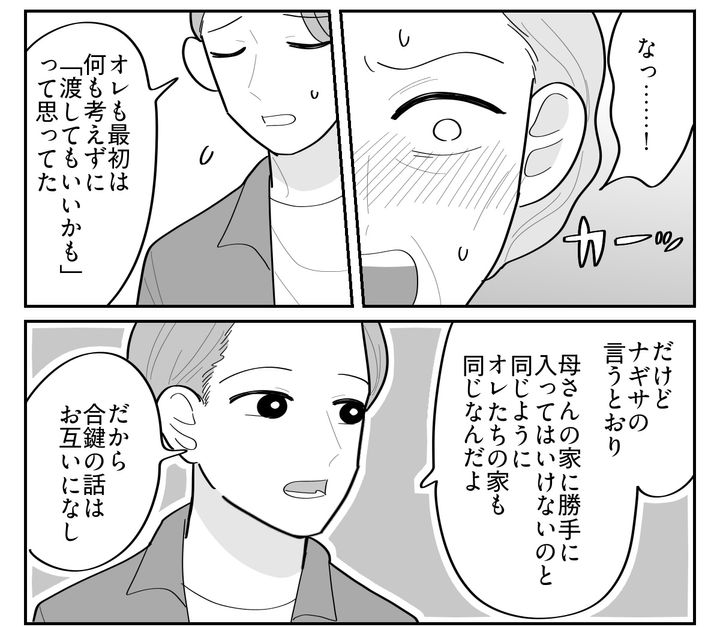私はナギサ、専業主婦です。夫のヨシハルと幼稚園児の息子カイトがいます。最近パートを辞めてヒマになった義母が、わが家の合鍵をよこせと言い出しました。そんなことをしたら勝手に出入りされ、家じゅうのものに手を出されまくるに決まっています。ヨシハルには「だったら私の実家にも合鍵を渡すべき」と主張して、プライバシーが侵害されそうになっていることを理解してもらいました。この調子で義母のことも説得していきたいと思います!