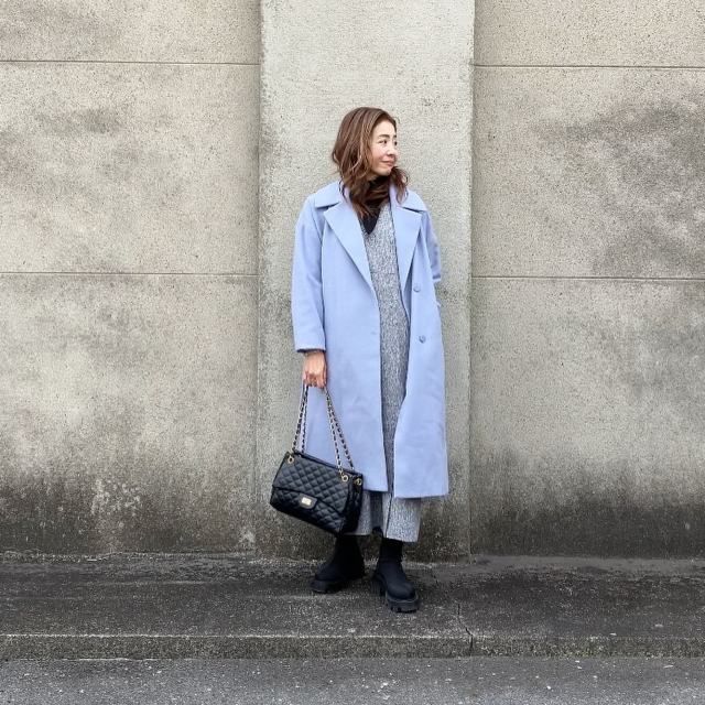 黒タートルネックに明るい水色のアウターを羽織れば、顔まわりがソフトな印象に。加えてモデルさんのようにグレーのアイテムを挟むと色のコントラストが和らいで、知的な大人スタイルに決まります。