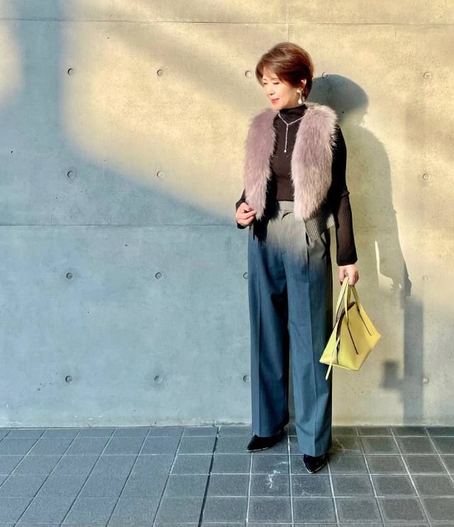 のっぺり見えがちな黒タートルネックには、ふわふわな質感のアイテムをプラス。ファージレなど黒タートルネックとは違う素材と組み合わせると奥行きが生まれ、シンプルになりすぎない着こなしに。旬のリッチな雰囲気も楽しめますよ。
