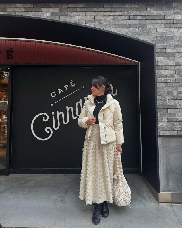 黒タートルネックの地味見え防止には、白を大胆に使うのが効果的。アウターにバッグにと白を重ねるよう加えて明るい色の面積を増やすと、顔映りがパッと華やかに♪