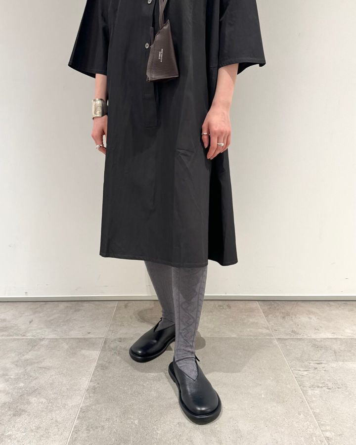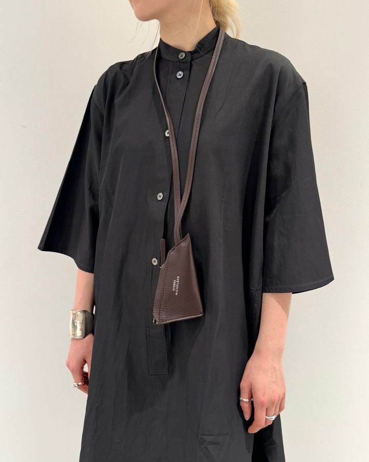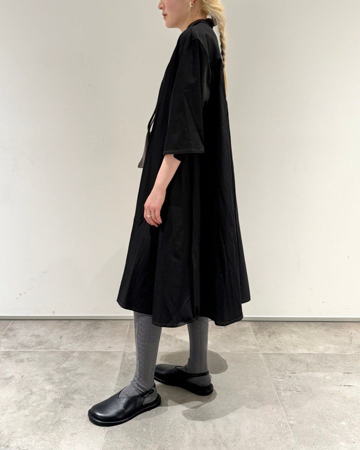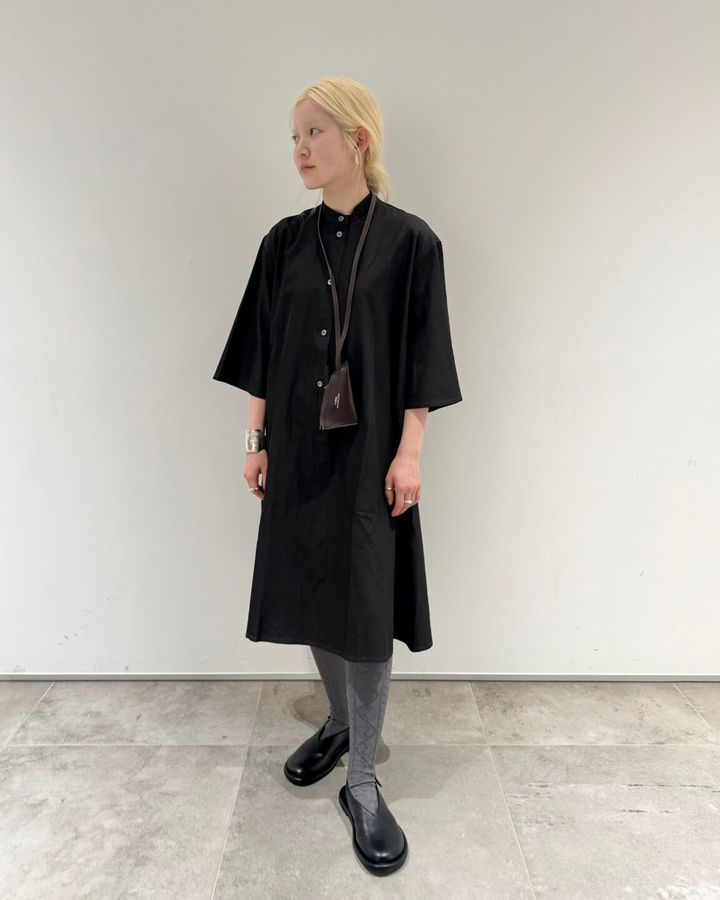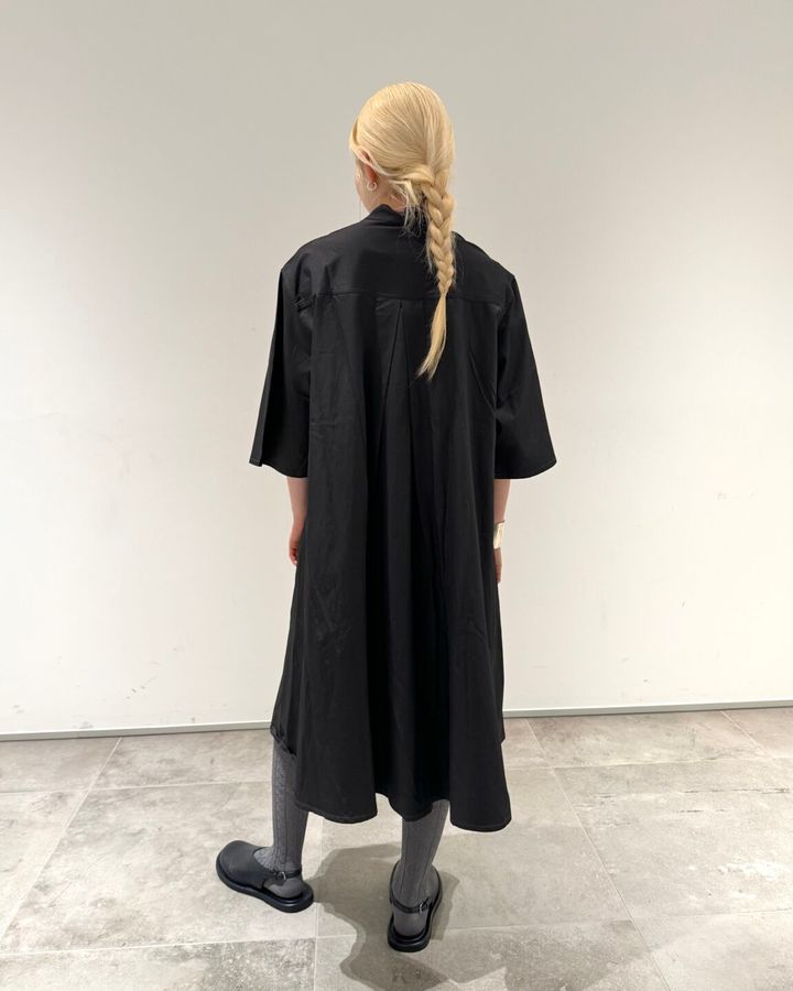 コットンとビスコースをmixしたツイル生地を使ったワンピース。ほのかに光沢感のある上質な風合いが素敵です。リラックス感のあるプルオーバーシルエット、裾へと流れるAラインシルエットが女性らしい。1枚で着てもサマになり、パンツに合わせてモードに着るのもおすすめです。