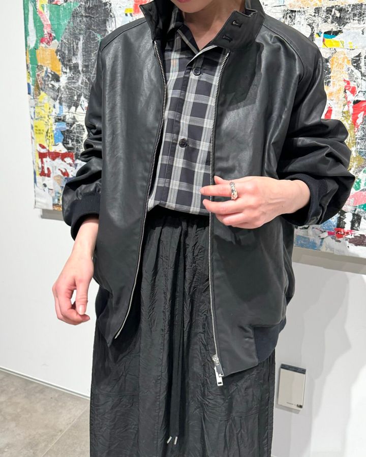 テキスタイルの質を最優先し、表面に表情をもたせたblouson。軽くてとても着心地が良いです。ゆとりもある為ユニセックスで羽織っていただけるお品です。中に着込めるのも嬉しいポイントです。STUDIO NICHOLSONらしくチェックと赤をポイントにスタイリングしています。