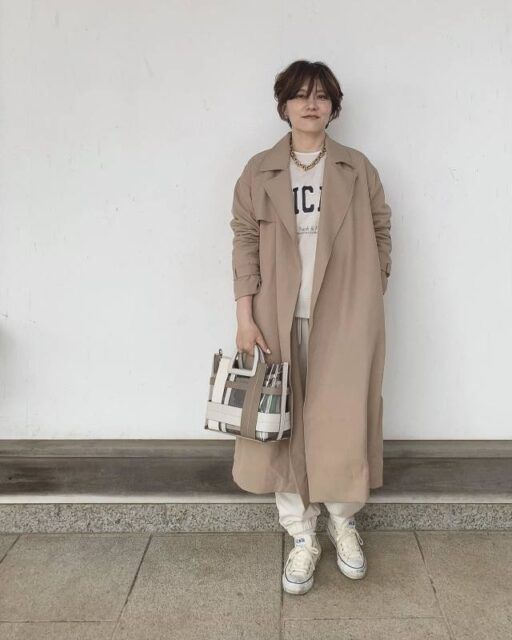 大人っぽいアウターは羽織るだけでサマになるもの。スナップのような「トレンチコート・テーラードジャケット」を合わせれば、スウェットパンツのルームウェア感を解消できます。しかもラフなスウェットパンツがコーデのハズしとなり、大人カジュアルに決まります。