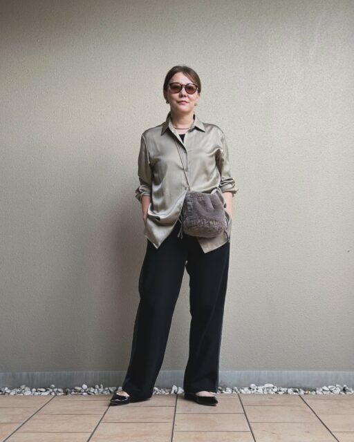 【50代×春のスウェットパンツコーデ4】ツヤのあるサテンシャツでお出かけモードに