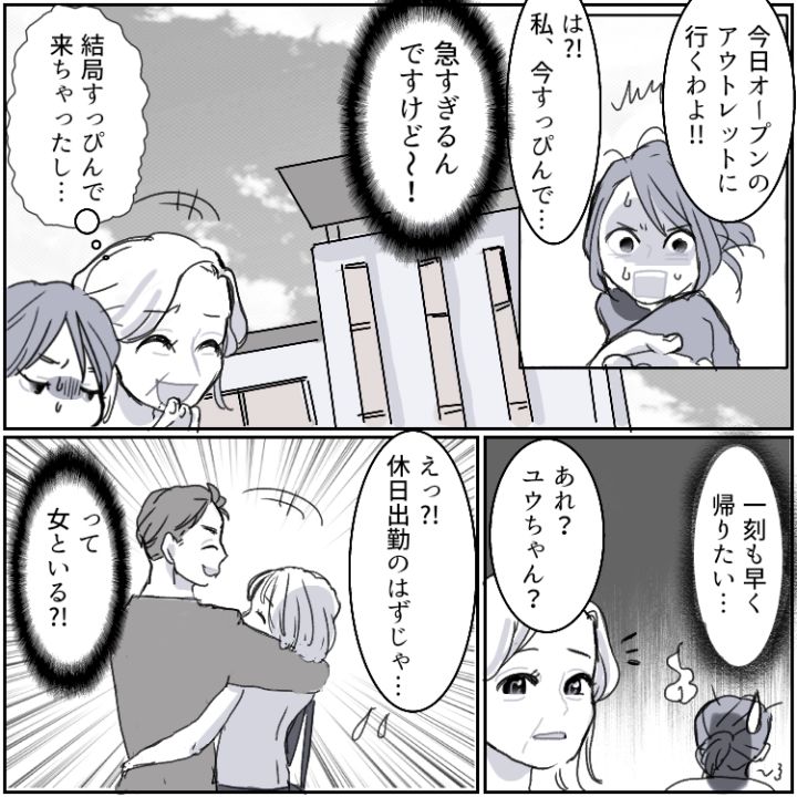 夫と結婚してから2年が経過したアキコ。しかし最近は夫の休日出勤や残業がやけに増えたため、彼の不倫を疑っていた。さらには、頻繁に義母がいきなり家にやってくるため、ストレスが溜まっていく日々だった。そんなある日、夫が不在の日に、朝早くから突然義母がやってくる。新しくオープンしたアウトレットに行きたいと言われて、仕方なく車を運転することに。しかし、なんと向かった先で信じられない光景を目にすることに!?