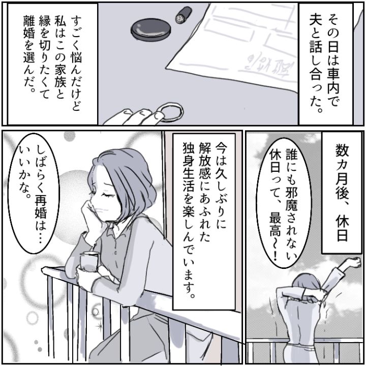 トンデモ親子と縁を切り、新しい生活をはじめたアキコ。これからは誰にも邪魔されない生活を楽しんでくださいね!