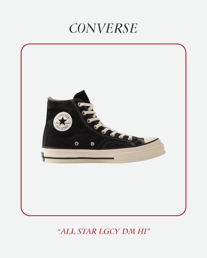 「1970年代に展開されていた“オールスター レガシー”のディテールを踏襲し、2025年に新モデルとして登場した“オールスター レガシー HI”。当時のデザインである“一ツ星”ヒールラベルや、肉厚なシューレースを採用したこだわりのモデルに『atmos』別注モデルが登場。品のあるデニム素材で男女問わずスタイリングしやすいのがポイントです」(「atmos」PR池澤さん)