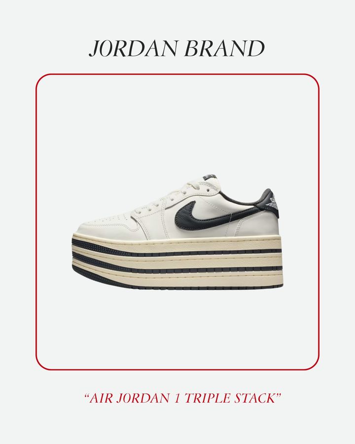 「3層ソールがドンッと盛れる、究極の厚底“エア ジョーダン 1”。セイル×ココナッツミルクというソフトなカラーパレットに、積み上げたトリプルスタックソールが圧倒的ボリューム感で足もとを一気に主役へと格上げ。クラシックな“エア ジョーダン 1”を大胆にアップデートした、盛れて映える“新世代厚底ジョーダン”です」(「atmos」PR池澤さん)