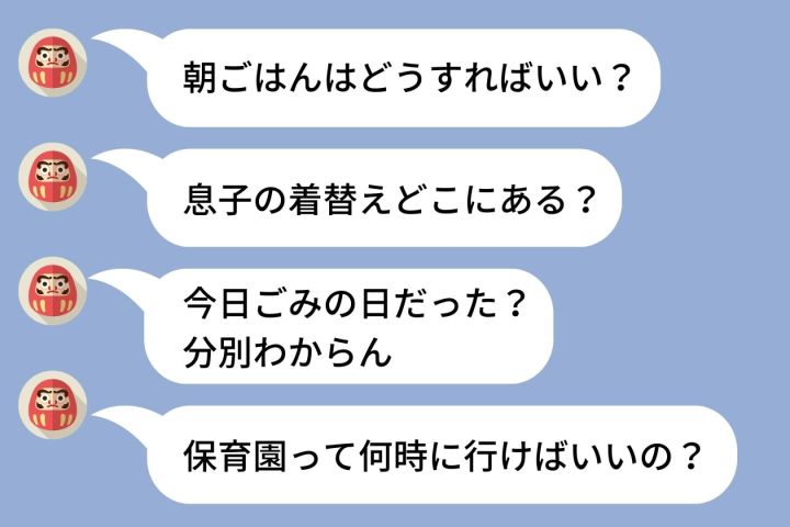 スマホを見ると夫からのLINEがいくつも届いていました。「朝ごはんはどうすればいい?」「息子の着替えどこにある?」「保育園の持ち物って何がいる?」