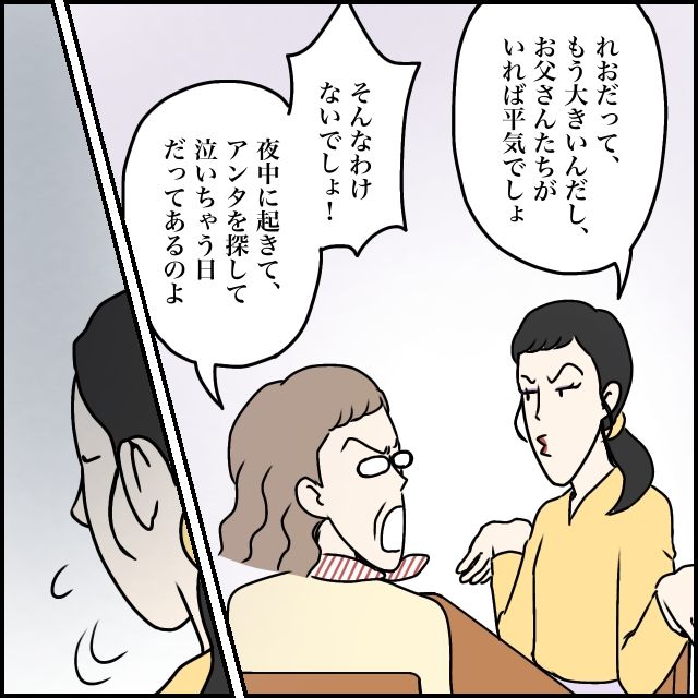 しかし玲美さんは、「れおだってもう大きいんだし、お父さんたちがいれば平気でしょ」と口を尖らせます。その言葉に義母は同じ母親として黙っていられず、「そんなわけないでしょ!夜中に起きて、アンタを探して泣いちゃう日だってあるのよ」と強い口調で非難しました。玲美さんはそう言われて気まずくなったのか、フイッと顔をそらします。