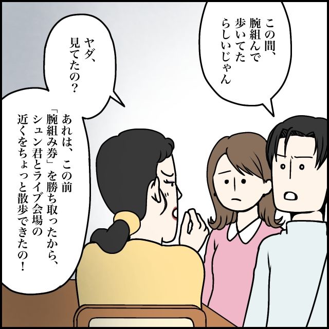 それでも太一は納得できず、「この間、腕組んで歩いてたらしいじゃん」と追及します。すると玲美さんは、「ヤダ見てたの?あれはこの前『腕組み券』を勝ち取ったから、シュンくんとライブ会場の近くをちょっと散歩できたの!」と、興奮気味に言いました。