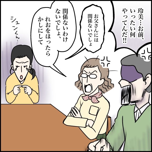 義父は「玲美、お前いったい何をやってるんだ!」と玲美さんの行動にカンカン。義母もまた、玲美さんの母親としての自覚のなさに呆れているようで「関係ないわけないでしょ、れおをほったらかしにして」と怒りをあらわにしました。