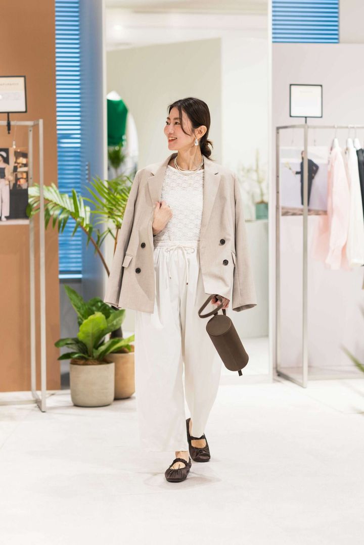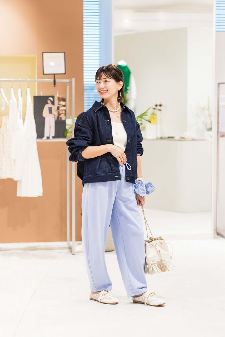 「優しいブルーカラーのパンツは程よく丸みがある立体的なフォルムが特徴。カジュアルになりすぎず着られるのも魅力的です。同系色のブルーストライプのショートパンツをレイヤードしてウェストデザインにポイントを。デニムジャケットは濃いめのインディゴを羽織り、コーデに締まりをきかせました。今話題のハイブリッドなバレエスニーカーで、足元にもトレンド感を効かせています」