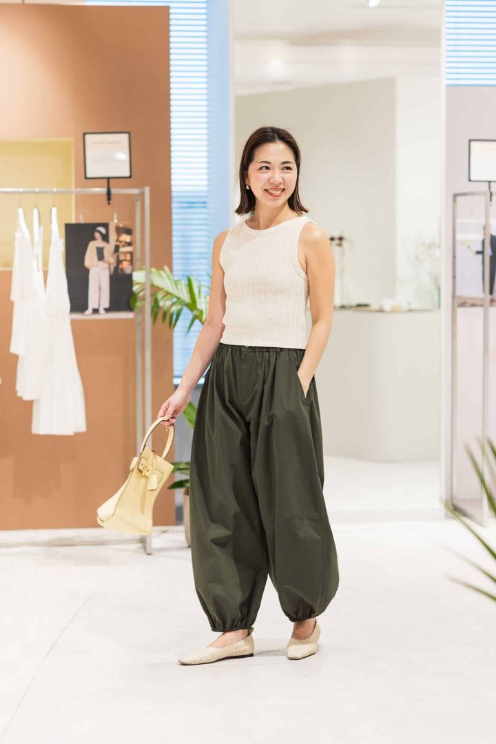 「ボリュームのあるカーキ色のバルーンパンツで自然な体型カバーを叶えながら、今っぽさをプラスしました。トップスは、コンパクトにまとめてバランスよく。ざっくりとした編地のニットタンクトップなので季節感を感じにくく、夏まで重宝するアイテム。足元はパンプスを合わせ、カジュアルダウンし過ぎないように全体を引き締めました。地味見えしがちなワン・ツーコーデが大人の余裕を感じるスタイルに」