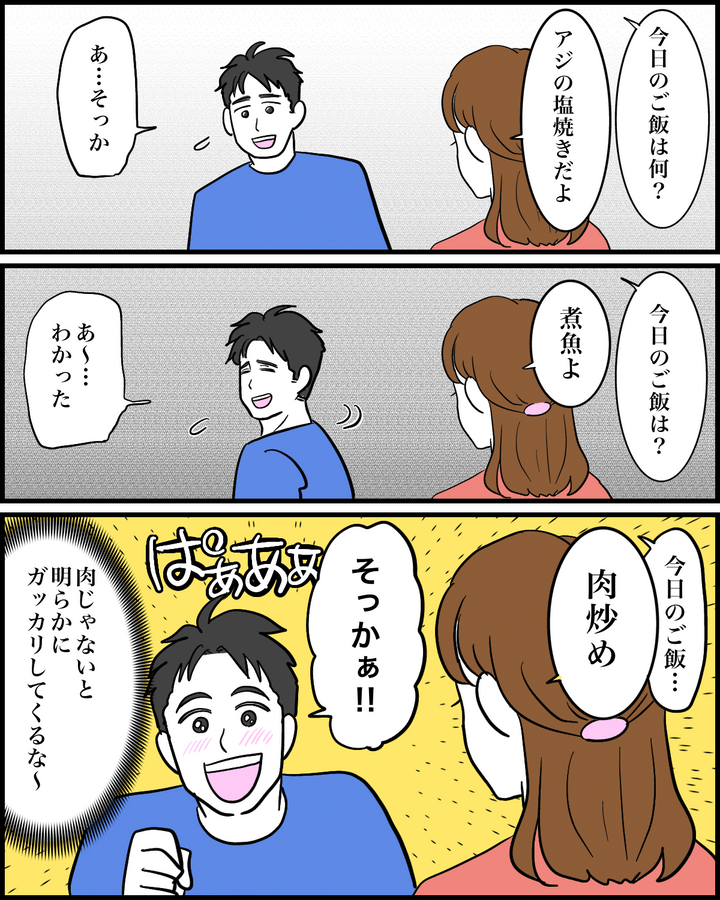 お気づきでしょうか。この夫、肉メインのメニューでないと明らかにがっかりするのです。これが“肉炒め”だと、満面の笑みを浮かべ「そっかあ!!」と即答するのだそう。まあ、かわいいと言えばかわいいですが……(笑)。なんというか、料理のしがいがないですよね。