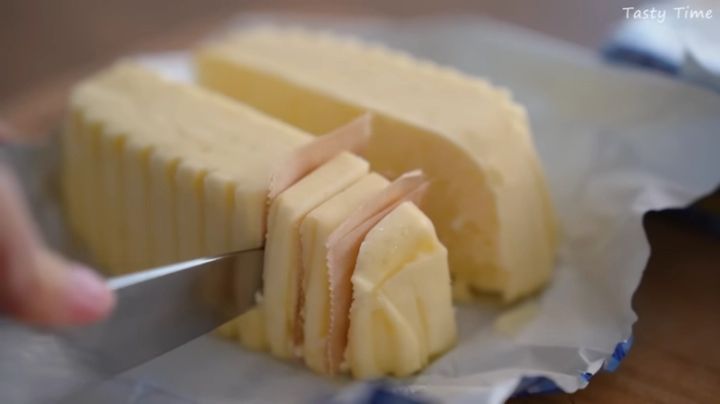 調理の際に使いやすいよう、あらかじめカットしておくのがTastyTimeさん流。包丁をクッキングペーパーで挟んだままスライスすると、包丁が汚れにくいだけでなく、バター同士もくっつきません。