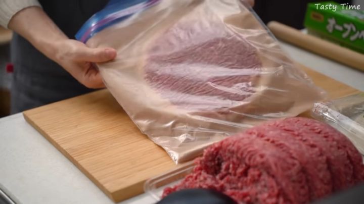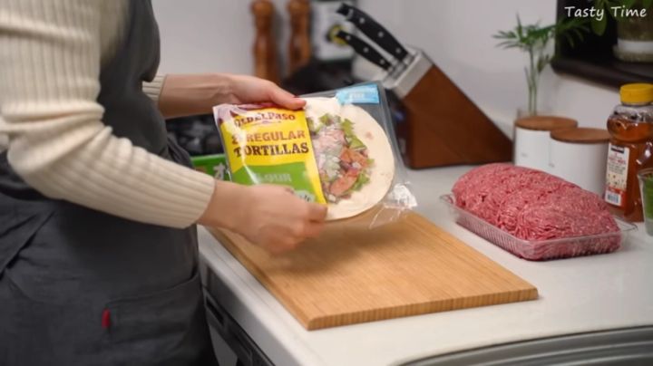 平日のごはんの準備をより手軽にするため、冷凍保存する前にひと工夫を加えましょう。トルティーヤの上に挽肉をのせてクッキングペーパーを重ね、麺棒で薄く広げます。クッキングシートごと重ね、保存袋に入れて冷凍しておけば、あとはフライパンで焼いて好きな野菜を挟むだけ!簡単においしいタコスが食べられる、ぜひ真似したい時短アイデアです。