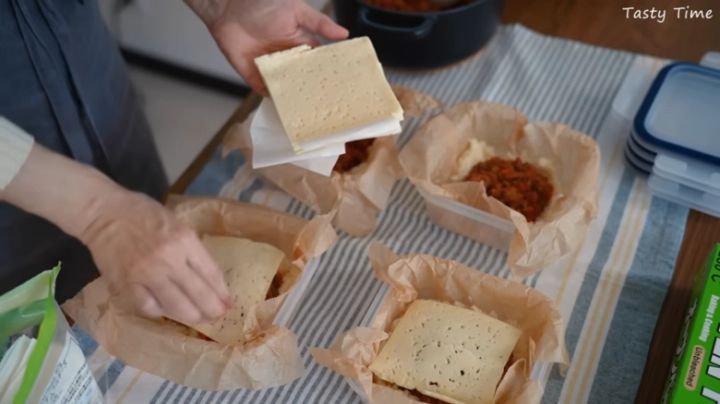 TastyTimeさんは、コストコの牛豚合挽肉を使った自家製ミラノ風ドリア弁当にチーズスライスをトッピング!チーズ同士がくっつかないようペーパーが挟まっているので、きちんと取ってから使用しましょう。