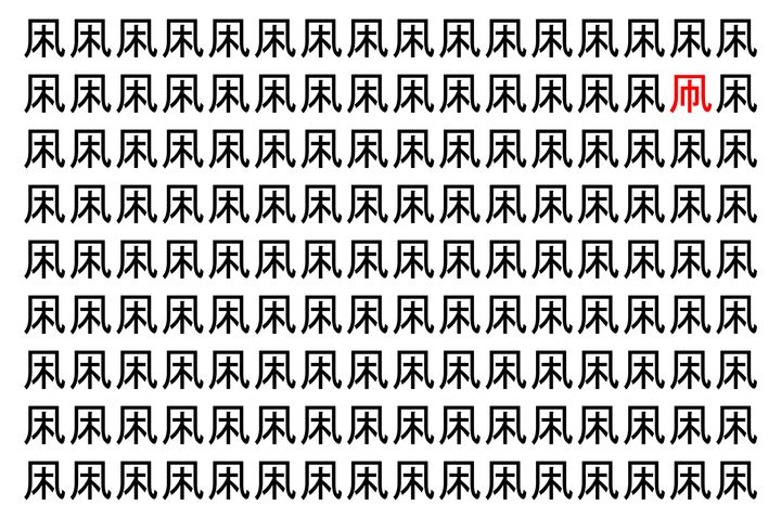 画像の中には、「凩」という漢字が縦に9行、横に16個並んでいます。 全部で144個となりますが・・・、そのうち1つは「異なる漢字」となってますよ!!
