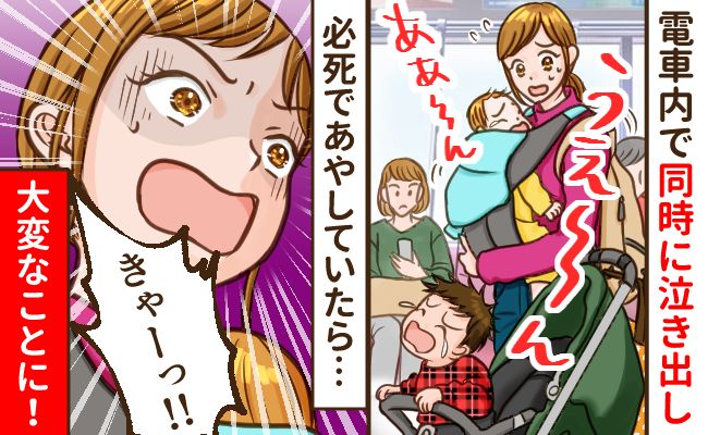 子ども2人を連れ、初めて電車で帰省したときのこと。ベビーカーと抱っこで移動していたのですが、電車に乗ると2人がギャン泣き。必死であやしていると、さらに悲劇が起こり……。