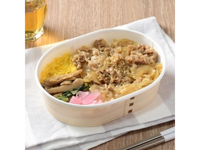 かつお・さば・昆布・煮干し・椎茸の5種のだしを効かせた優しい味わいの牛めしです。副菜に、玉子そぼろ・ぶなしめじ炒め・野沢菜・梅しそ大根を盛り合わせました。
