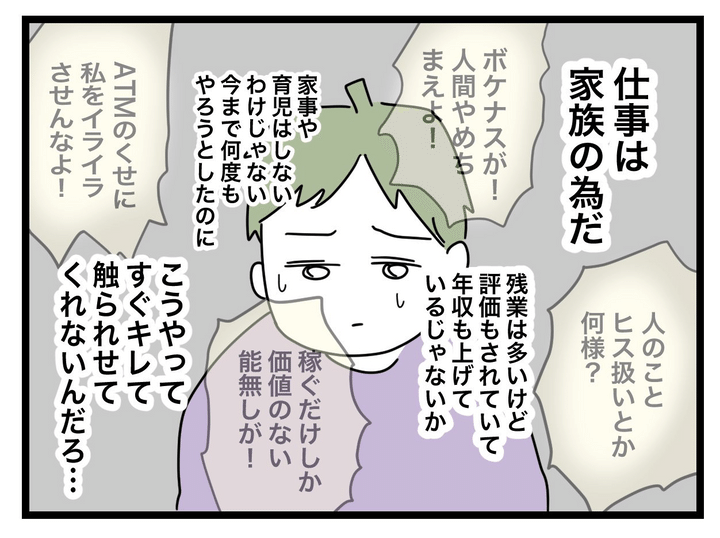 「でくの坊」という言葉にはさすがに引っかかった夫。妻に怒鳴られている言葉の数々をそのまま返したら、即離婚を突きつけられることは明白。家事育児についてもやろうとしなかったわけではなく、手を出すとすぐに怒られるからやれなかっただけ…。
