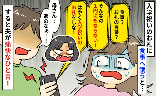 すかさず夫が「お礼は何度も言っただろう? ごはんにも誘ったし、これ以上なにが言いたいの?」と返します。すると「言葉のお礼なんかもらっても1円にもなりゃしない! こういうときはお礼の品を用意するのが礼儀です! 年老いた両親をごはんに連れて行くのは当たり前でしょう! なんのお礼にもなってない」とさらにヒートアップ。