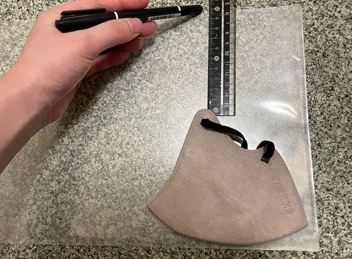 きれいになったら、いつも使っているマスクをクリアファイルの隅に合わせて重ね、サイズを確認します。
