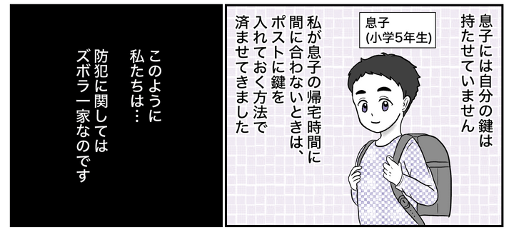 私はアンナ。夫のコウシロウと、小学5年生の息子との3人家族です。私たちが暮らしているのはオートロック付きの賃貸マンションの一室です。夫はよく家の内鍵を閉め忘れる人。私が指摘すると「荷物で両手がふさがっていたから」とか「面倒だったから」とか言っています。ただ私もつい部屋の鍵をかけ忘れて出かけてしまうことがあるので、あまり人のことは言えません。そんな感じで、防犯に関してはズボラな夫婦だったのですが……?