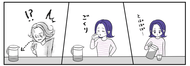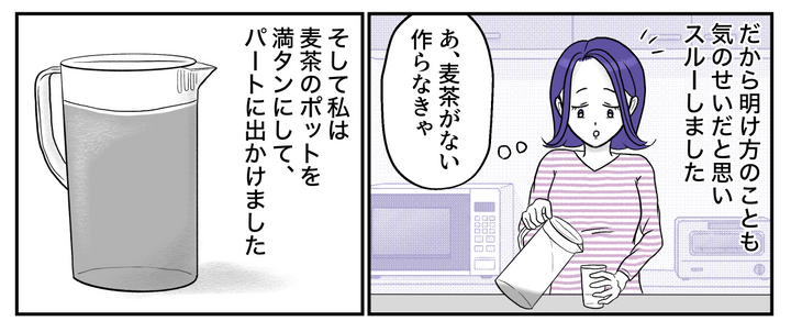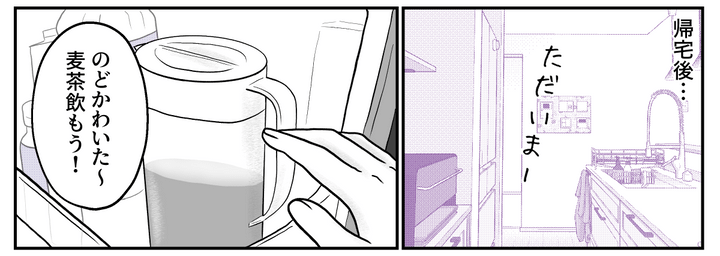 私はパートから帰宅すると麦茶ポットを冷蔵庫から取り出し、コップにお茶を注いで飲みました。