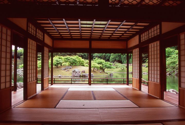 現在はお茶屋として営業している掬月亭(きくげつてい)は、1600年代初頭に建てられた茅葺き屋根の建物。茶室は南池の近くにあり、四方から入ることができるように建てられた四方正面の造りが特徴的だ。池に一番近い部屋、「掬月の間」の畳から、ある角度で水を眺めると、水面に浮かんでいるような感覚を味わうことができる。