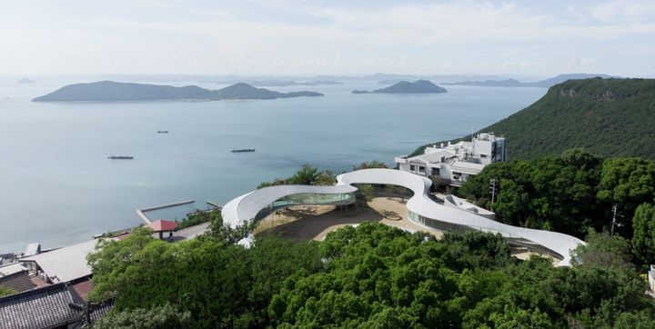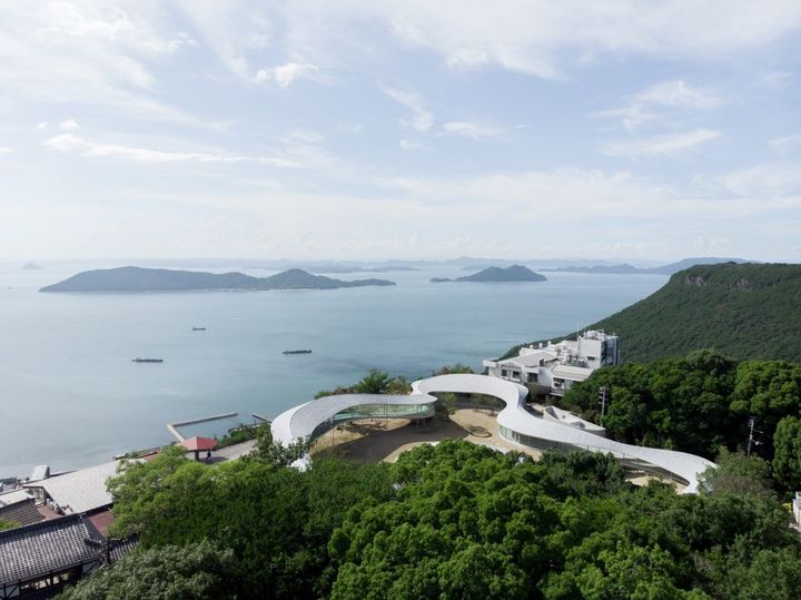 ゆるやかな曲線でつながれた、瀬戸内海に浮かぶ島々を思わせる各施設は、周辺の景観を損なわないように高さが抑えられており、海や街の風景と調和する。