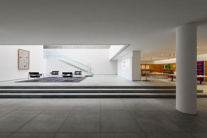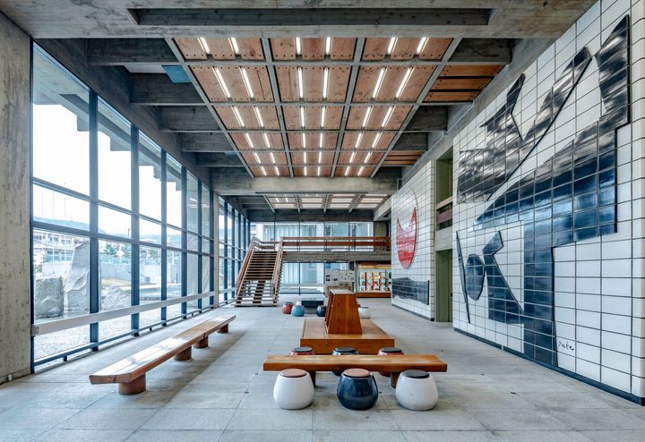 館内にも見どころは多く、丹下健三の研究室がデザインを手掛けた家具が今も残るロビーでは、香川県出身の芸術家、猪熊弦一郎による壁画《和敬清寂》が存在感を放つ。ガラス窓からは南庭とピロティが見えるが、丹下は屋外の風景との一体感を味わえるように窓枠の高さを調整。床面には、小豆島で産出された花崗岩を使用した。