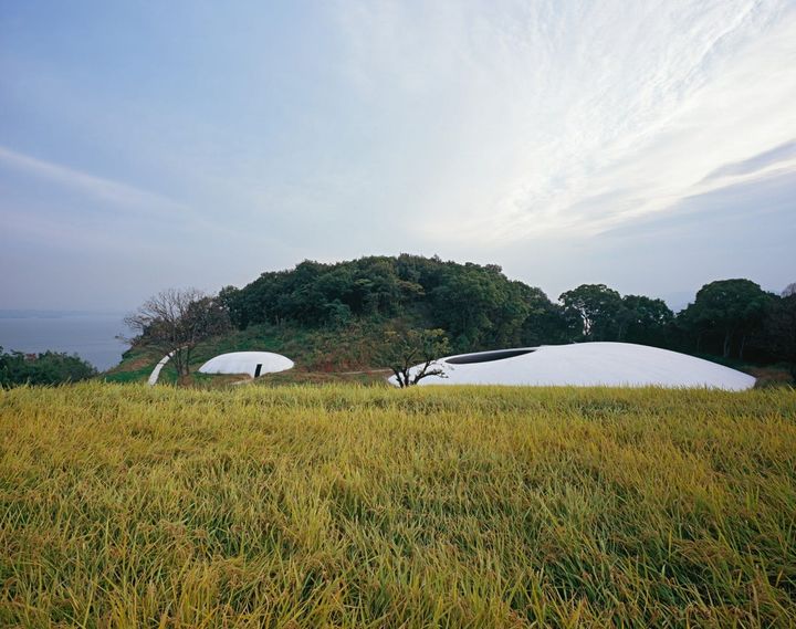 瀬戸内海を望む豊島唐櫃(からと)の小高い丘に立つ豊島美術館は、西沢立衛が、アーティスト、内藤礼の作品のために設計した美術館。その形は、一滴の水が地上に最初に落ちた瞬間を想起させる。美術館の広さは約40×60m。最高部の高さが4.5mの背の低いコンクリート・シェル構造で、建物には柱が1本もない。