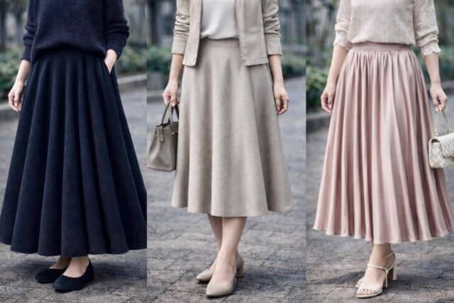 数年前に定番だった、たっぷりとしたロングフレア。安心感はありますが、裾にボリュームが集まりすぎると、春の軽さとは少しずれて見えることがあります。特に黒や濃色、厚みのある素材は、冬の延長のような印象になりやすい傾向です。