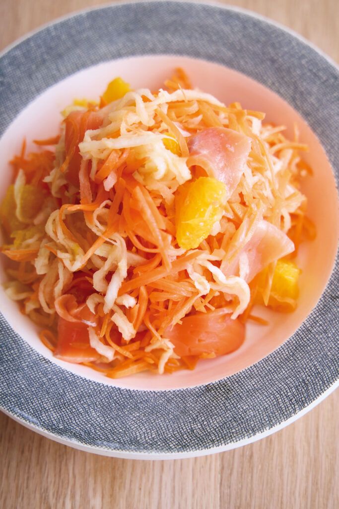 シャキシャキとした食感に、オレンジのさわやかな香り。そこにスモークサーモンのうまみを重ねれば、ぐっと華やかなラぺに変身。いつもの常備食材が、食卓に彩りを添える一皿に仕上がります。