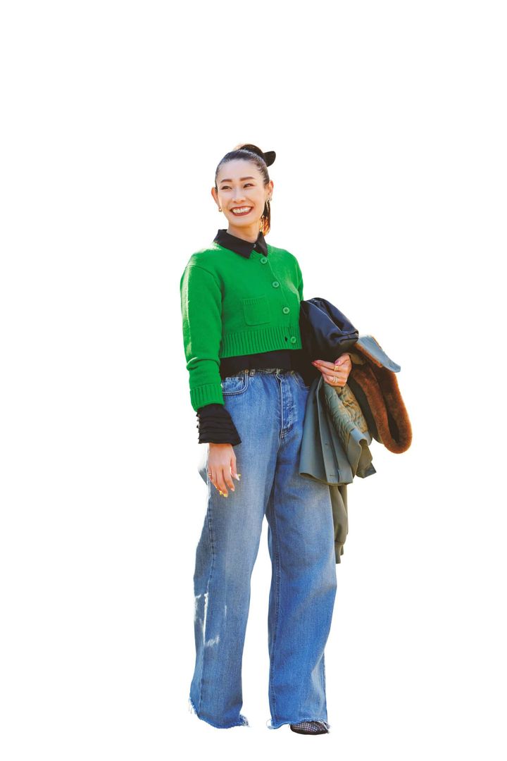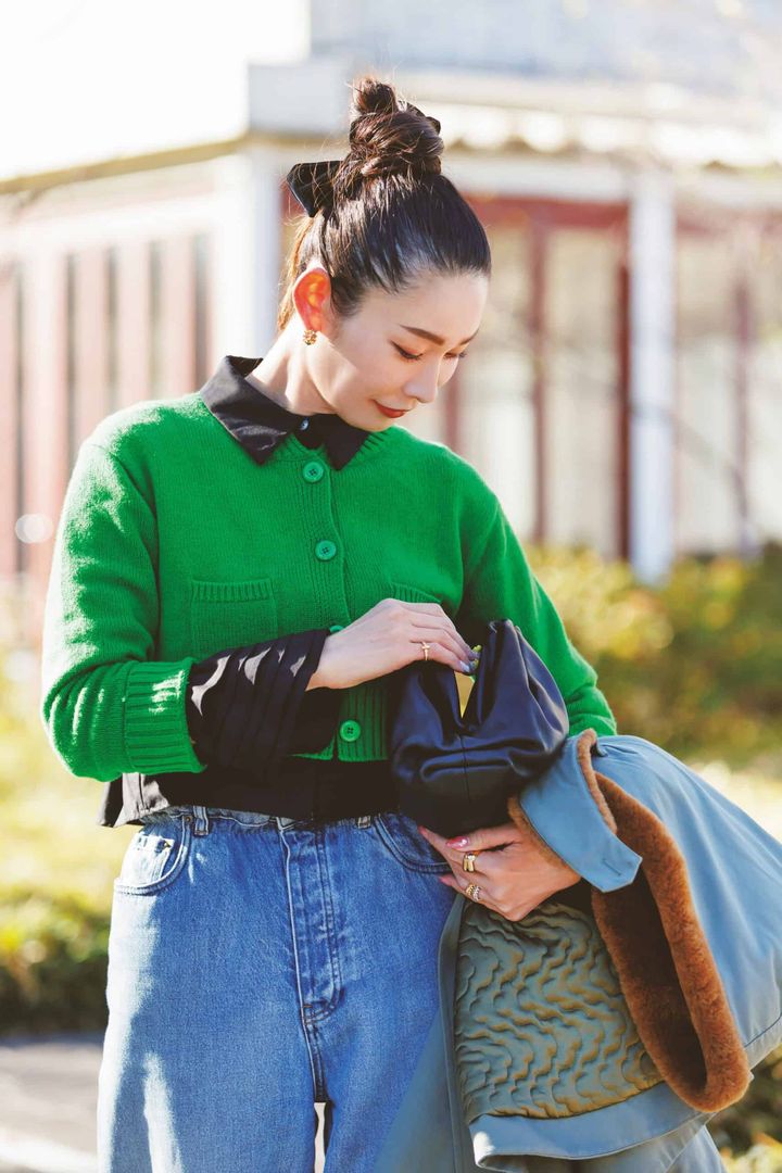 鮮やかなグリーンカーデにフリルシャツを重ねて華やかに。デニムが抜け感をキープしつつ、黒を効かせることで全体にメリハリが生まれます。甘さとカジュアルのバランスが絶妙な春レイヤードです。