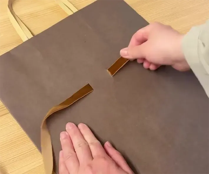 縦の切れ込みにリボンを通します。