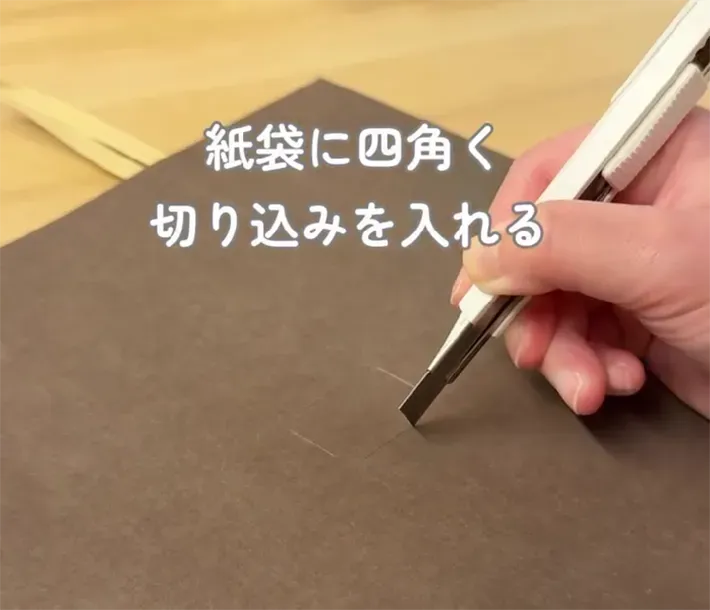 紙袋に縦2本、横2本の線を、4角形を描くように切り込みを入れます。