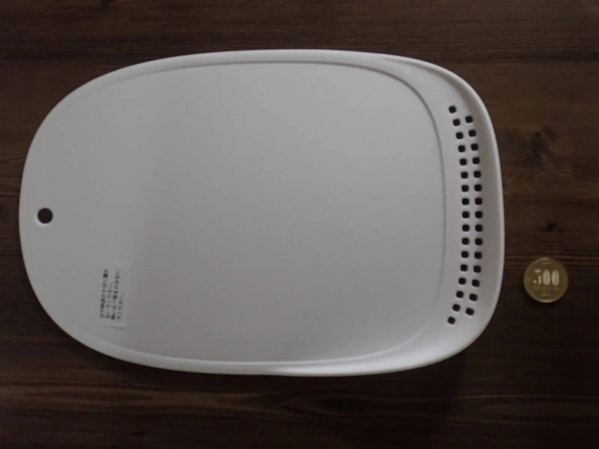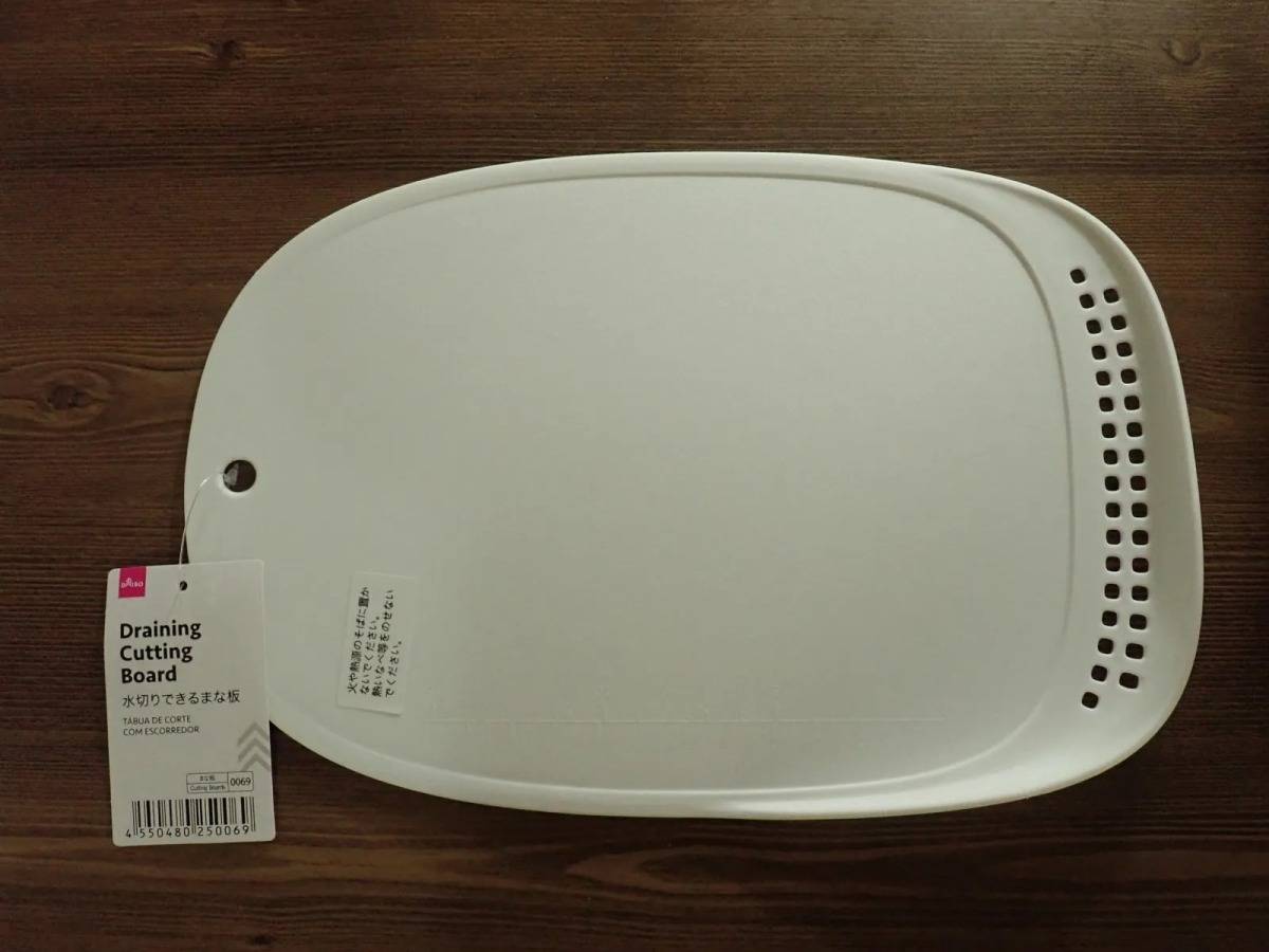 DAISO(ダイソー)の「水切りできるまな板」は、まな板の端に水切りが付いた調理グッズです。