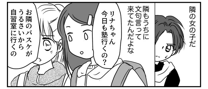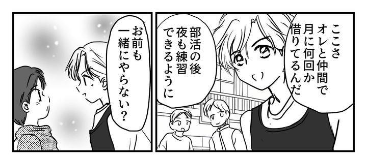オレはトウマ。中学生。そろそろ3年生が引退の時期。2年生になる前にもっと強くなりたいオレは毎日家でも練習を始めた。でも近所の人が学校に文句を言ったせいでオレは夜の練習ができなくなった。このまま練習を続けると退部させられてしまう。さらに憧れの先輩に冷たい目で見られて、オレはすごくショックをうけた。家の近くで、隣の女の子がちょうど学校から帰ってくるところなのが見えた。隣も文句言ってたからなにか言われるかもしれない……そう思って影に隠れた。