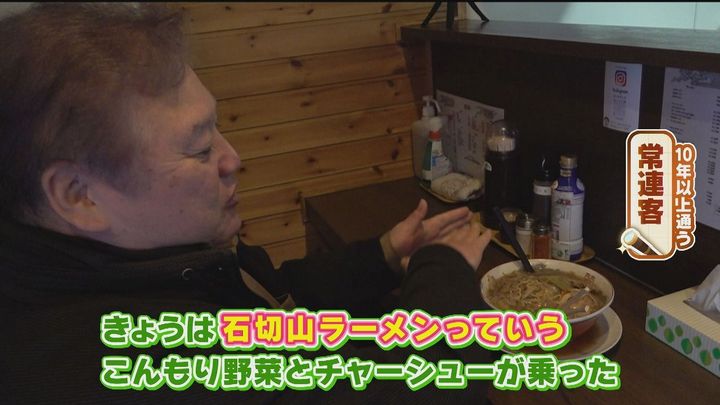 常連客:「きょうは石切山ラーメンという、こんもり野菜とチャーシューがのった特別なラーメンなんですよね」