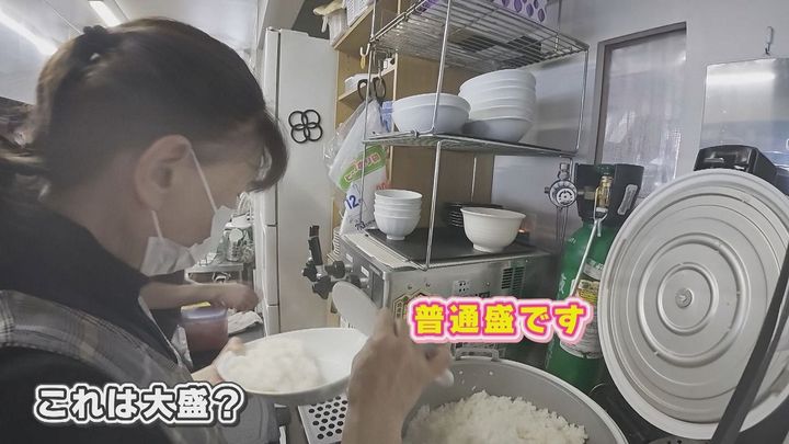 番組スタッフ:「これは大盛ですか?」店舗スタッフ:「普通盛です。大盛はもっと。もっと!」