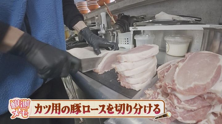 カツ用の豚ロースを手際よく切り分けていきます。