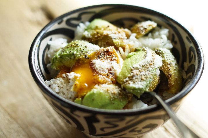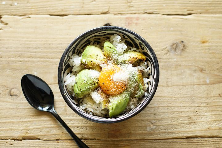 1:器にご飯を盛り、アボカドをスプーンですくってのせ、卵をのせる。