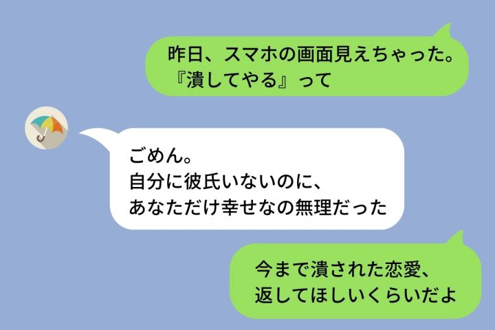 「あんたが潰してやるって言ってたの、言いすぎじゃない?w」「彼氏できる度に毎回言ってるよね」。 「潰す」。私の恋愛を、潰す。心配なんかじゃなかった。彼女は最初から、私が幸せになるのが嫌だったのです。