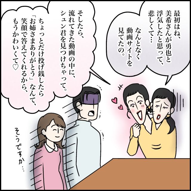 勇也さんが私と浮気していると勘違いしていた頃、悲しさから何気なく動画サイトを眺めていたとき、偶然流れてきた動画でシュンくんを見つけたそうです。少しだけ投げ銭をしたら「お姉さまありがとう」と笑顔で答えてくれたのが嬉しくて、どんどん沼にハマっていったと言います。