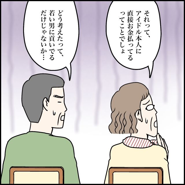 推し活がどういったものなのかよく分からない義両親は、「それってアイドル本人に直接お金払ってるってことでしょ」「どう考えたって若い男に貢いでいるだけじゃないか・・・」と不安そうな表情を浮かべます。