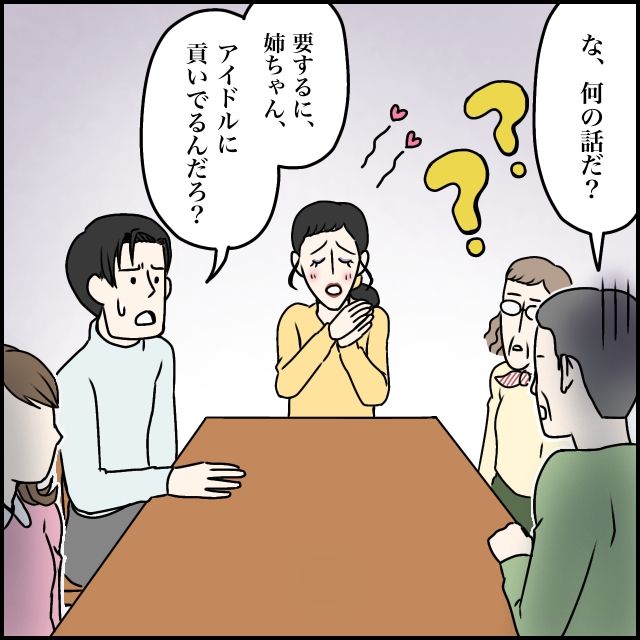 義父は、玲美さんの話が理解できず、「な、何の話だ?」とポカンと口を開けます。すると太一が、義父にも分かるように「要するに姉ちゃん、アイドルに貢いでるってことだろ?」と嚙み砕いて問いかけました。